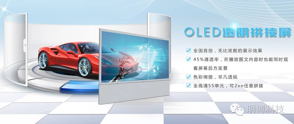 明博科技透明拼接屏具有超薄OLED模组结构,极大地改进了原来液晶显示屏的整体架构,突破了传统显示屏 的播放形态,拓宽了传统显示屏的应用范围。